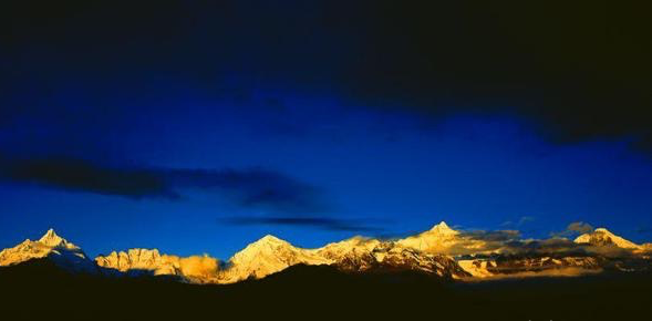 日照金山是指阳光洒在梅里雪山的主峰卡瓦格博及周围山峰上,金光闪闪,犹如一座金山。早晨日出时分,阳光穿透云层,洒在雪山之巅,金色的光芒与雪山的洁白交相辉映,形成一幅美轮美奂的画面。当清晨的太阳跨过群山,光从空中倾泻而下,整片雪山由粉红变橙红,最后变成金灿灿的一片,宛如一座金色宫殿,蔚为壮观 。